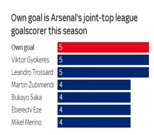 现场观战的记者布里兹点评,“乌龙球成了阿森纳本赛季的最佳射手,这一数据在埃兰路新闻区引发了轰动。虽然这会成为头条新闻,但这也提醒我们阿森纳在引发禁区混乱方面是多么有效。”